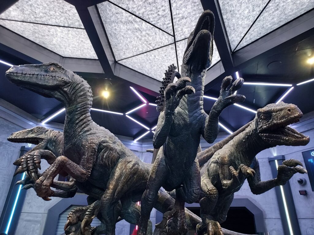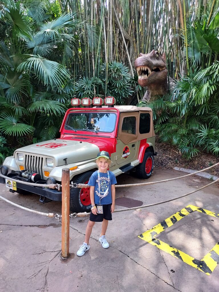 – Le monde de Jurassic Park a fasciné notre petit garçon. Les maquettes de dinosaures sont toutes superbes et les attractions proposées géniales. Il faut bien sûr mentionner le Vélocicoaster, le grand huit qui va aussi vite qu’un vélociraptor ! Nana et Gueg l’ont adoré. Malheureusement, au moment où LN avait enfin eu le courage de vouloir la tester, il y a eu une panne à 10 minutes de pouvoir y accéder. L’attraction sur la rivière de Jurassic Park est très surprenante. Finalement, elle aura bien suffi à LN 😁.